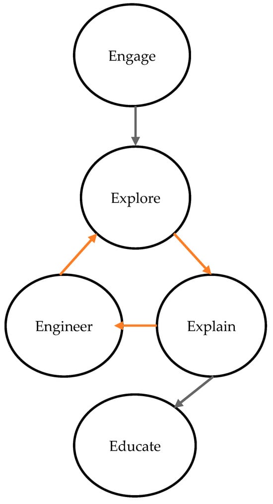 Many existing programs guide the learning of STEM topics through either science or engineering practices, but not both. For example, the 5-E instructional model [] provides a five-step approach to science investigation (Engage, Explore, Explain, Elaborate, Evaluate). The 5-E instructional model is based on the research-based learning cycles of Atkin and Karplus [] and Piaget [] and it is currently associated with more than 235,000 lesson plans. Other programs emphasize science learning through the practices of engineering [,]. While many of these programs are outstanding, they also reveal a gap in the literature. We address this gap by designing and evaluating an instructional model and a curricular program that fosters learning science content through science and engineering practices in a creative, mutually beneficial process.