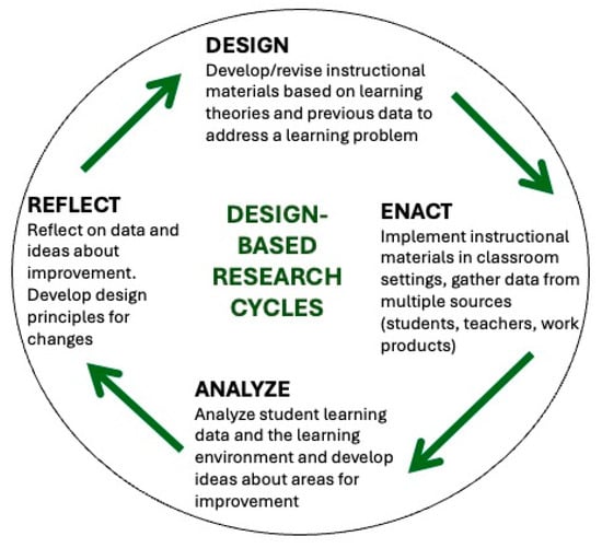 DBR studies are conducted in research cycles, with each research cycle consisting of four steps: design, enact, analyze, and reflect (see Figure 2). Each research cycle results in the collection of data on features of the innovative learning environment and student and teacher evidence of how such environments work in the settings for which they are designed []. As the test responses and work products generated by students are only a proxy for the learning process itself, the final step of each cycle is a reflection on the goals, the salient features of the learning environment, population, and learning outcomes in order to develop design principles to support changes for the next cycle and to help explain learning outcomes.