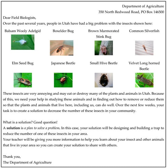 Between Cycle 1 and Cycle 2, we gathered information from Cycle 1 teachers and students that we used to make improvements to the Cycle 2 Invasive Insects unit. However, as outlined in Table 1, we still only implemented each phase (Engage, Explore, Explain, Engineer, Educate) one time. Drawing from student and teacher interviews and our research results, we made two major changes to the Cycle 2 version of Invasive Insects. First, we introduced an invitation from the Department of Agriculture to study local invasive insects (Figure 3) as the first Engage activity in the beginning of lesson 1. This placement provided an opportunity to provide a clear interdisciplinary phenomenon to introduce epistemic agency [] for students’ study of local invasive insects throughout the unit. Building from this charge for studying local invasive insects, students conducted many of the same activities as in Cycle 1, including gathering data on local organisms and creating a class-wide database on the number and kinds of animals observed in their local area. Student teams conducted research on one local invasive insect to determine if their invasive insect was disruptive to local ecosystem stability, health, or agriculture.