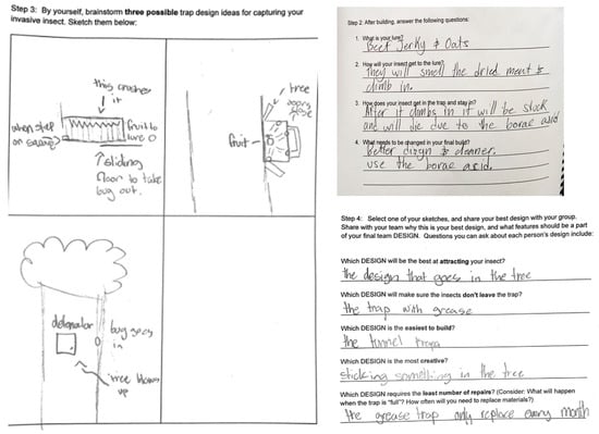 As occurred between previous cycles, we drew on teacher interviews and the consistent lack of improvement on our pre-post engineering design assessment tasks to make more pronounced changes to the Invasive Insects unit for Cycle 3. In particular, we gathered essential information from our teachers who indicated that the two groups of Cycle 2 students who physically built their insect traps seemed more engaged in the unit and had stronger final presentations. Building from student outcomes and feedback, we initiated a significant change to the Cycle 3 version of Invasive Insects: we introduced iterations between the Explore–Explain–Engineer phases, and we asked teachers to implement each of these phases two times. This action resulted in two important changes. First, we required that all student teams needed to physically construct at least two builds of their insect trap. Second, we added four reflection questions after student teams constructed their first build of their insect traps to specifically guide the creation of a more successful second trap build. Sample student trap designs and these reflection prompts are presented in Figure 4. The reflection questions included asking student teams for information on their selected lure, trap entrance, and trapping mechanism that would more likely attract their chosen invasive insect but no other animals or insects in the area. Some of the changes that students made to their builds included the trap components that were suggested by the questions, but students also cited improvements they needed to make in terms of trap structure and stability, cost of materials (students were given a USD 10 constraint with which to “purchase” supplies), and trap maintenance. After completing their two trap builds, students researched and chose an optimal location for their traps. While some students were able to place their traps in the locations they had selected and collect a brief amount of data about trap effectiveness, most teams did not have time for these activities in the allocated six weeks. As shown in Table 1, the final phase progression of activities in Cycle 3 was: Engage, Explore, Explain, Engineer, Explore, Explain, Engineer, and Educate.