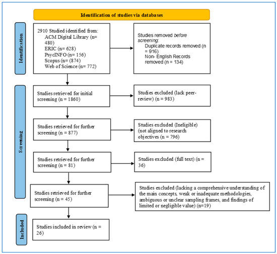 - Population (P): Postgraduate students (Master’s or Doctoral programmes). Screening: During title and abstract screening, the researchers prioritised studies that explicitly mention postgraduate students as the target population. Excluded studies that focused on primary education, secondary education, undergraduate education, or broader student populations without specifying postgraduate levels.