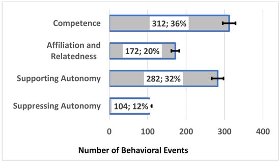 Frequency analysis of the various motivational types: overall approach. The first research question related to the types of motivation that teachers encouraged. Findings show that teachers supported autonomy and competence more than they suppressed autonomy and supported relatedness. Table 2 shows these comparisons. Supporting autonomy and competence had similar frequencies (32.4% and 35.9%, respectively; Z = −0.75, p = −0.450). Similarly, suppressing autonomy and supporting competence showed no significant difference in frequency (12.0% vs. 19.8%, respectively; Z = −1.68, p = 0.096). However, supporting autonomy and competence were found to differ significantly from the proportional use of suppressing autonomy and relatedness (suppressing autonomy: Z = −4.02, p < 0.001; Z = −4.61, p < 0.001; relatedness: Z = 2.92, p = 0.004; Z = −3.69, p < 0.001). These results were found to align with Benjamini and Hochberg’s adjustment for false discovery rate [66]. In addition, a χ2 test to check whether the observed proportions confirm the null hypothesis (i.e., the relative rate of each type will be 25% equally) showed that the null hypothesis was rejected (χ2(3) =128, p < 0.001). Figure 1 shows the frequencies and proportions of the different behavioral types.
