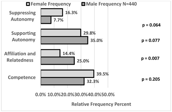 Another key finding was the significant difference in teachers’ support of boys’ motivation compared to that of girls; teachers gave more support for relatedness to boys than to girls. This finding supports the research hypothesis and corroborates previous studies that indicated that female students respond better than male students to teacher-given empathy [43]. Despite this, the amount of empathy and interest that the girls received was significantly lower than the prevalence of support for the relatedness that the boys received from the teachers.