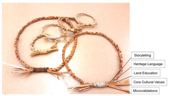 The authors chose a double-twined cedar rope as a metaphor for the teaching practices that nurture children’s cultural identity development. Cedar bark rope is an important traditional resource for cultural groups along the Pacific Northwest coast throughout the geographical range of the red cedar, including the homelands of the Tlingít and Ts’msyen nations in southeast Alaska and British Columbia, Canada. Historically, cedar bark rope was used for fishing lines, anchor lines, buoy lines, and lashing items in ocean-going canoes [25]. Notably, the method of separating the bark into narrow strips, then twining them together into strands, and then twining the resulting strands into even thicker rope results in incredibly strong rope capable of catching large fish, such as halibut, that might weigh up to 100 kg [26]. If one imagines that each of the identified CID- nurturing teaching practices (teaching and using the heritage language of the land where you teach; framing lessons around cultural stories; land-based education; teaching through cultural values; and micro-validations) as a strip of cedar bark that is twined together to make a strand, then twining that rope with academic curriculum, one can imagine the resulting rope as a lifeline that can support Indigenous and non-Indigenous students, leading them toward academic success and positive life outcomes (see Figure 1).