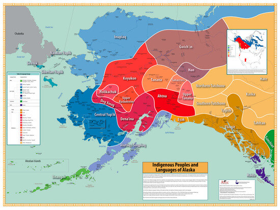 - Krauss, M.E.; Holton, G.; Kerr, J.; West, C.T. Indigenous Peoples and Languages of Alaska.Alaska Native Language Center and Institute of Social and Economic Research: Fairbanks and Anchorage, AK, USA. 2011. Available online: https://www.uaf.edu/anla/collections/map/ (accessed on 1 July 2024).