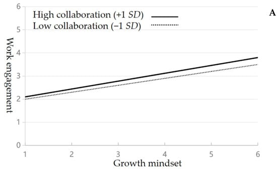 First, collaboration within the context of the school climate refers to the degree of cooperative engagement among teachers, including shared planning, communication, and resource sharing [19]. Collaboration highlights how teachers work together to improve instruction, solve problems, and foster a positive work environment. In the context of teacher collaboration, several studies support the moderating role of collaboration in the relationship between a growth mindset and work engagement. Collaborative activities such as shared planning, co-teaching, and resource sharing are seen as key mechanisms for fostering professional growth and enhancing teachers’ engagement [20,21]. When teachers work together, they are more likely to remain motivated and resilient in the face of challenges, thus further amplifying the positive effects of a growth mindset [22]. Collaborative environments provide social and professional reinforcement, which can lead to better instructional practices and increased job satisfaction [23]. Consequently, collaboration appears to play a positive moderating role in enhancing the impact of a growth mindset on teacher work engagement.
