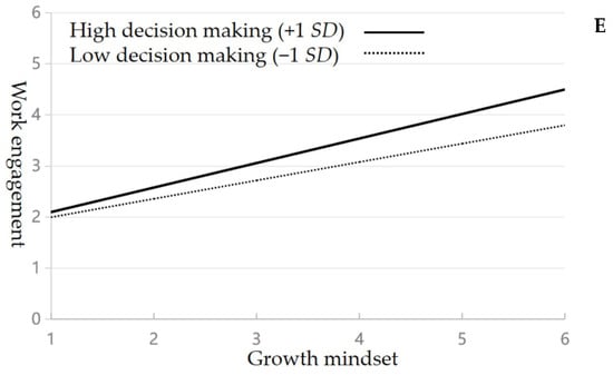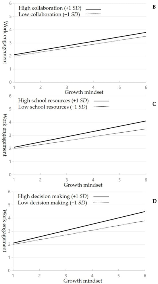 Fourth, decision-making in school climates refers to teachers’ involvement in shaping policies, curricula, and administrative strategies, which impact both the classroom environment and school operations. Teacher participation in decision-making fosters a greater sense of agency and can influence job satisfaction, resilience, and professional engagement [32]. Additionally, active involvement in decision-making enables teachers to address practical concerns and improves their readiness for change, contributing to their professional growth [33]. When teachers feel empowered to participate in decisions, they may be more open to growth mindset practices and demonstrate stronger work engagement [34]. Thus, decision-making seems to positively moderate the relationship between teachers’ growth mindset and work engagement, consistent with previous studies emphasizing the role of autonomy in fostering engagement.