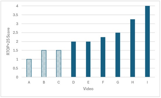 RTOP+ Indicator 25 scores for Tier 2 analysis. Videos whose scores are shown in diagonal stripes were removed from consideration as a high-discourse lesson. All Tier 2 videos were double-coded with excellent inter-rater reliability (ICC = 0.788, SD = 0.297). Scores shown are the average of the two ratings.