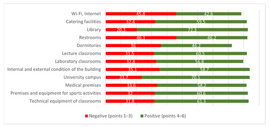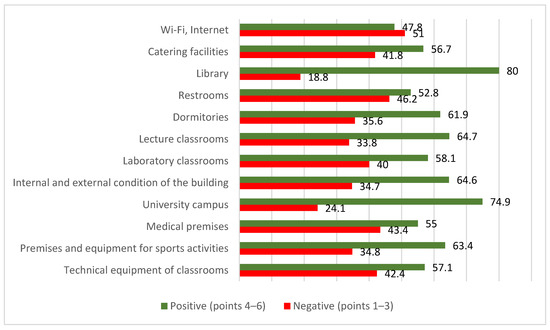 | Infrastructure | Poor equipment of the library and inaccessibility of the modern fund of educational literature Weak WI-FI and internet speed Low quality of maintenance of restrooms and medical centers in universities Low level of technical equipment in classrooms Non-compliance of the infrastructure of universities with the rules and standards of operation for people with special needs |