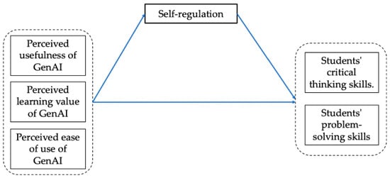 Moreover, the discussion on GenAI’s educational potential is not without its concerns. The literature [] points to the need for a deeper understanding of how GenAI applications can support the development of self-regulated learning practices and metacognitive strategies—skills that are paramount for students to manage their learning processes, adapt strategies, and reflect on their learning journey. Despite the extensive literature highlighting both the advantages and challenges of incorporating technology into higher education, there remains a notable gap in empirical studies examining AI’s role in enhancing self-regulated learning and the development of metacognitive skills []. This gap points to the need for a detailed investigation into how GenAI might either facilitate or impede the cultivation of essential cognitive skills such as critical thinking and problem solving. To address this, our research is designed to assess the extent to which GenAI can support or hinder these key areas of student development. We propose to investigate a theoretical model that centres on three specific attributes of GenAI: perceived usefulness, ease of use, and perceived learning value, and their collective impact on fostering critical thinking and problem-solving capabilities among students. In addition, this study aims to explore the potential mediating role of self-regulation on the relationship between GenAI use and the enhancement of critical thinking and problem-solving skills. The guiding research questions for this investigation are as follows: (1) What is the relationship between the use of AI and the development of students’ critical thinking and problem-solving skills? And, (2) does self-regulation serve as a mediating factor in the relationship between AI use and the enhancement of critical thinking and problem-solving skills? Through this research, we aim to contribute valuable insights into the effective integration of GenAI tools in educational settings, specifically focusing on their potential to enrich students’ learning experiences by enhancing critical cognitive skills and facilitating a more self-regulated approach to learning.