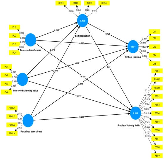 In Figure 2, the resulting value indicates that the combined effect of perceived usefulness, perceived learning value, and perceived ease of use explains a 45.3% variance in self-regulation (). The R-squared value of 0.501 for critical thinking and 0.609 for problem-solving skills indicates that approximately 50.1% of the variance in critical thinking and 60.9% of problem-solving skills is explained by the combined effect of perceived usefulness, perceived learning value, and perceived ease of use of AI. The Standardised Root Mean Square Residual (SRMR) is 0.067, which is below the threshold of 0.08 as suggested by Hu and Bentler (1999) [], indicating a good fit.