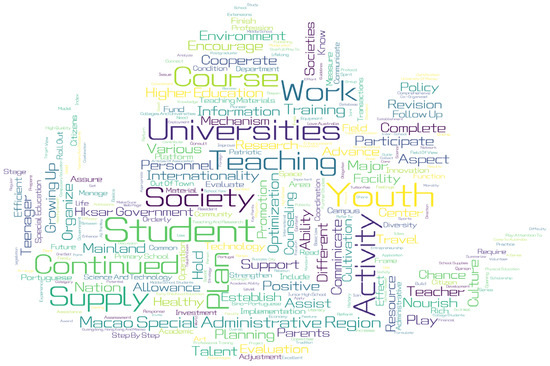 Theme 2 was clustered around the theme of language education development. Bilingual education is an important feature of Macao’s education system. The policy emphasizes the promotion of Chinese–Portuguese bilingual education, with the aim of improving students’ language proficiency and cross-cultural communication skills. The policy also focuses on the practical language skills of graduates and strengthens students’ international perspective through cooperation with overseas educational institutions.