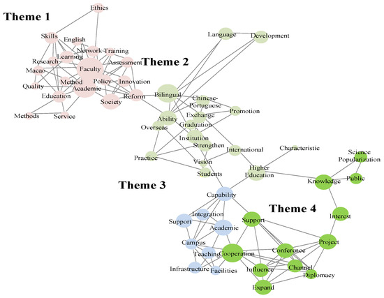 Theme 4 was clustered around the theme of popular science and international exchange. Popularization of science education and international exchanges occupy an important place in Macao’s education policy, aiming to enhance public awareness of and interest in scientific knowledge as well as to promote international cooperation and cultural exchanges. The policy supports academic exchange programs, the organization of international conferences, and the expansion of Macao’s international educational influence through diplomatic channels.