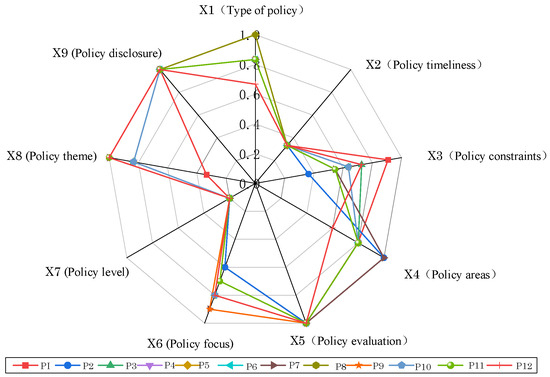 The PMC index of each education policy was analyzed above. In order to facilitate the comparison, the mean values of each level of index X1–X9 are calculated and analyzed in detail in this paper, and Figure 4 shows the PMC surface of each education policy.