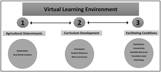 First, agricultural determinants (ADs) refer to the agriculture sector outside academia and include principles such as stakeholders, risks, needs, company databases, and real-world problems [37,38,41,42]. The stakeholders are defined by the Oxford Dictionary of Economics as individuals or groups with a vested interest in a business or venture [43]; in this case, with interest in closing the theory–practice gap in agricultural sciences. According to Catal and Tekinerdogan [42], industry stakeholders play a crucial role in developing new courses at HEIs. Risks, needs, and agricultural intelligence should be incorporated from the perspective of these stakeholders. By identifying their risks, needs, and agricultural intelligence, the new course can be designed on sound agricultural principles. Agriculture intelligence refers to the trends, data, and information in the agricultural sector related to commodities, technology, and practices. This further enhances the authenticity of the new course.