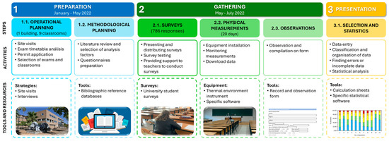 In this case, the data collection stage comprised three steps: (1) completion of questionnaires; (2) physical measurements of environmental parameters; and (3) observation. This stage’s purpose was to gather information mainly from three sources: the building, the occupants, and the researchers [75].