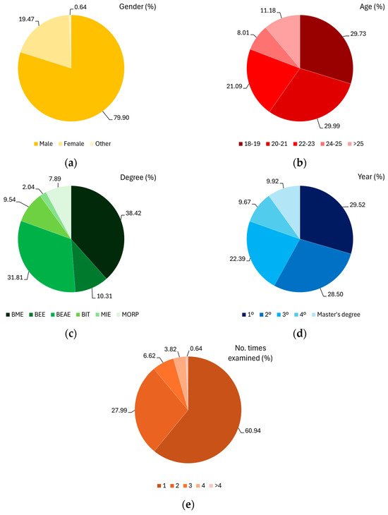 In terms of gender (Figure 2a), males were the majority, representing 79.90% of the population (628 students), whereas females constituted 19.47% (153 students). Only 0.64% of the students did not identify themselves as male or female. This gender distribution is typical of engineering colleges [9,73,122,123].