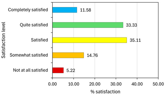 Figure 3 shows the percentage distribution corresponding to the scale of students’ satisfaction with their performance in the exams. Within the 786 valid responses collected from the questionnaires, 35.11% (276 students) considered themselves satisfied, while 33.33% (262 students) stated that they were quite satisfied. In addition, 11.58% (91 students) were totally satisfied, making a total of 79.02% of students with a positive perception towards their exam performance. On the other hand, 14.76% (116 students) were not very satisfied, and 5.22% (41 students) were not satisfied at all, representing 19.98% of students experiencing some degree of dissatisfaction. These results indicate that although most students were happy with the exams, there was a significant minority, suggesting the need to analyse which factors may negatively impact the assessment process to increase their overall satisfaction [124,125]. Furthermore, knowledge of all these factors is essential to mitigate them and improve the student experience [80]. Analysing these factors together and prioritising them is crucial, as it allows identifying which ones have the greatest impact and which ones need to be addressed more urgently. By identifying and prioritising them in this way, it is possible to implement more effective strategies that reduce their influence, contributing to a more positive and effective learning environment [126].