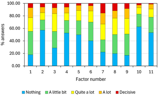 Figure 4 shows a disaggregated analysis of how the factors identified in the literature review, listed from 1 to 11 as shown in Table 2, have negatively affected students’ academic performance during their exams. As can be seen, the main factors that students considered decisive in their performance were “Coincidence or closeness in time with other exams” (15.52%), “Exam preparation” (11.83%) and “Exam difficulty” (8.27%). These factors have highlighted the importance of planning and time management [80], as well as the tested content complexity [14].
