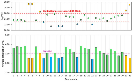 First, we analysed how the average operative temperatures (Top) measured during the tests affected the students’ satisfaction, as shown in Figure 5. The red dashed lines represent the comfort temperature range of ISO 7730:2005 (between 23.00 and 26.00 °C) [115]. The purple dotted line shows the level of satisfaction at which the perception of the exam was considered satisfactory (level 3). As can be seen, there was a clear correlation between the operative temperature and the level of student satisfaction. Temperatures within the comfort range, represented by green dots, tended to be associated with higher levels of satisfaction (green bars), while temperatures outside this range, both higher (yellow dots) and lower (blue dots), tended to be associated with lower levels of satisfaction (yellow and blue bars, respectively). This effect was observed by Li and Patel [83] and Lan et al. [132], especially in cases with elevated air temperature. In the specific case of test number 8, although the temperature was slightly above the comfort range, the average student satisfaction was above 3. This might suggest that, although Top was outside the comfort range, the perceived simplicity of this particular exam may have compensated for the small degree of thermal discomfort, resulting in a favourable average satisfaction. Ultimately, this analysis suggests that maintaining temperatures within the recommended comfort range may contribute significantly to improving students’ perception of satisfaction during exams [63,84].