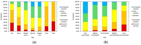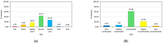 On the other hand, this study has shown an interest in the students’ thermal comfort assessment and its impact. Specifically, questions were included to assess the thermal sensation (Thermal Sensation Vote, TSV) and degree of comfort (Thermal Comfort Vote, TCV) [112]. For the TSV, a seven-point scale was used to rate responses from hot (+3) to cold (−3). As can be seen in Table 3, values of −1, 0, and +1 indicate comfort, while −3 and −2 indicate cold discomfort, and +2 and +3 indicate heat discomfort [112]. For the TCV, a five-point scale was used to quantify responses from very comfortable (+2) to very uncomfortable (−2). This scale was created by McCartney and Nicol in 2002 [113] and has since been used in multiple studies [60,73,114].