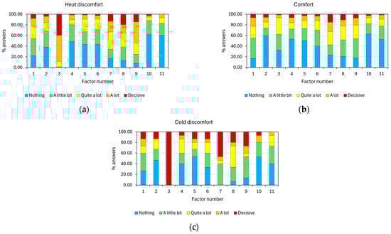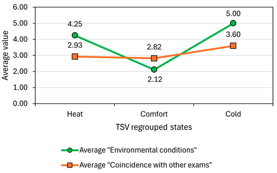 As has been shown in the previous analysis, environmental conditions have been revealed as a factor with a great influence on the student’s perception of their performance in the tests. Therefore, it is of interest to analyse how the different weather scenarios recorded have had an impact on satisfaction with the exams, as well as on the thermal sensation and perceived degree of comfort [62,131].