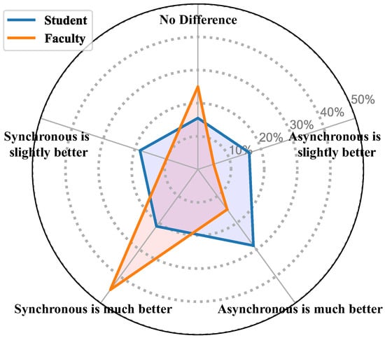 When considering preferences regarding online courses offered synchronously vs. asynchronously, student preferences were generally evenly divided, whereas faculty mostly preferred synchronous online labs. Figure 2 is a radar chart visualizing the combined opinions of students and faculty regarding the delivery mode. Each axis represents a category of opinion, and the distance from the center indicates the proportion of respondents in each category. The results show 55% of faculty believe synchronous labs are better for students’ learning, compared to 39.7% of students. In contrast, only 20% of faculty believe asynchronous labs are better for learning, compared to 44.8% of students.