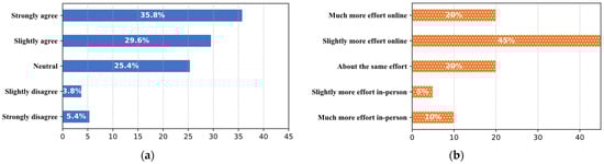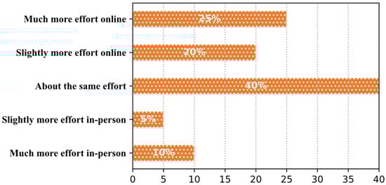 As shown in Figure 4, faculty responses indicate a belief by many that there is an increased effort required for online labs. A significant 45% of the faculty reported that preparing online labs takes more effort than in-person labs, with 25% stating that it takes “much more effort online”. This viewpoint reflects the complexities and challenges faculty face when transitioning lab courses to an online format. Notably, 40% of the faculty felt that the effort is about the same, suggesting that a substantial portion of faculty may have adapted efficiently to the online mode.