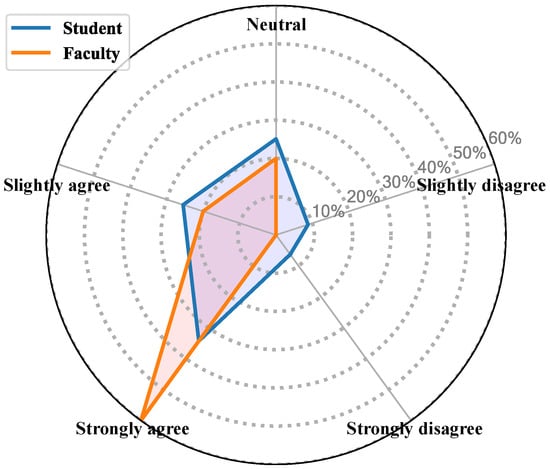 This section focuses on assessing the perceived value of student collaboration in online learning environments. The survey question (refer to Figure 5) aims to understand the role of peer interactions in the successful completion of online laboratory tasks, and how these interactions influence the overall learning experience and outcomes in team-based project assignments within an online context. Figure 5 illustrates the collective views of both students and faculty regarding the online collaborative assignments. Every axis on the chart corresponds to a different category of response, and the radial distance from the center reflects the percentage of respondents aligned with each specific category.