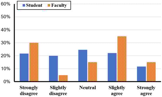 Performance and acceptance were modestly increasing in online labs in general, as well as computer labs up until the pandemic. While use briefly soared during the pandemic, average performance and satisfaction actually declined because of the sudden transition, inadequate resources, various psychological stresses from overuse to isolation, the forced enrollment of many opposed to taking or teaching online, etc. [,]. With the relative normalization of the education panoply of offerings, the increasing sophistication of online labs, and growing number of proprietary, public domain, and university-built options, positive perceptions might be expected to increase. Our study is an example of that expected trend with less than one third of students and one quarter of faculty believing that online learning in computer science labs cannot be as good as face-to-face. Of course, the caveat in the wording of the question is “can be”, not “are”. Those statistics would likely be less impressive if the reality, rather than the possibility, were assessed.