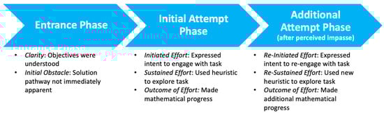 The Initial Attempt Phase determines whether and how a participant initiates and sustains their effort, as well as the results of this effort, while engaging with the task. Here, perseverance is demonstrated by a participant showing intent to engage with or enter the task through problem-solving (Initiate Effort component). When the participant chooses to pursue the problem, perseverance is further evidenced by their actions to engage with or attack the task, using a problem-solving heuristic to navigate the uncertain mathematical situation (Sustain Effort component). Consequently, perseverance is also indicated by making or reflecting on one’s perceived progress toward understanding the mathematical ideas at play or by solving the problem completely (Outcome of Effort component).