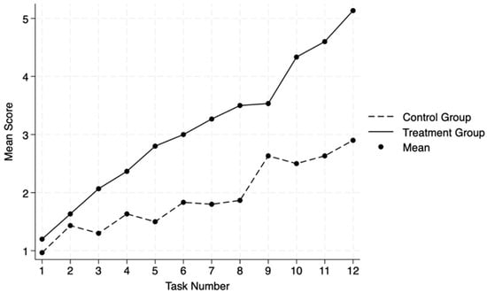 Across all HLM buildings, Model 5, which included a random slope for task only, was found to be the best fit for the data. After adding the interaction term between group and task in Model 5, the coefficient for the group was no longer significant (see Table 4). This indicates that the relationship between the 3PP growth rates of the two groups changes over time. Examining the profile plot (see Figure 2), it appears that the 3PP growth from Task 1 to Task 2 appears very similar regardless of group. However, after Task 2, the 3PP growth rates of the two groups appear to diverge, with the treatment group exhibiting greater growth in 3PP scores over time from Task 2 to Task 12.