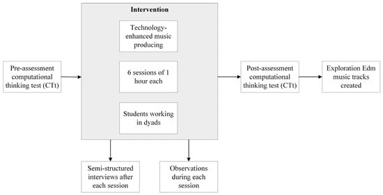 Considering the above, it would be valuable to determine whether less common approaches can also have a distinctive impact on the (further) development of CT. Therefore, we investigated whether addressing auditory modalities through the self-creation of electronic music using technology-enhanced music-producing software has an effect on CT development and what important influences therein can be attributed to creativity. To this end, an exploratory mixed-methods design study was conducted using 21 primary school students aged 10 to 13 in which CT proficiency was assessed using the validated Computational Thinking Test (CTt) [