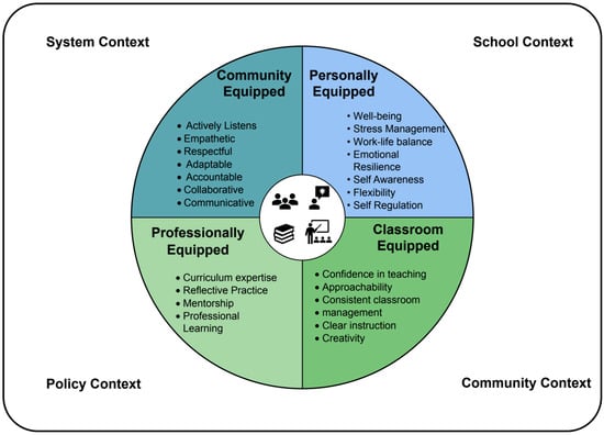 Teacher’s capacity to connect and contribute to their community through shared expectations hinges on critical intrapersonal attributes, including empathy, adaptability [] and accountability. These attributes enable teachers to understand and share the feelings of others, create connections and adjust to new conditions and changes within their environment, building resilience.