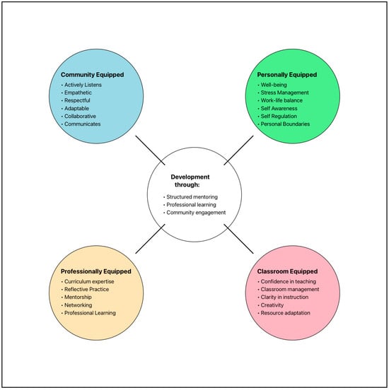 The findings from this research offer valuable insights that can significantly inform the preparation of rural teachers in initial teacher education programs. The concept of being “equipped” rather than merely “ready” suggests a need for a more comprehensive approach to teacher preparation that goes beyond traditional classroom readiness, as reflected in current government reviews and policies [,]. Initial teacher education programs should focus on developing a range of attributes across four key areas: community, personal, classroom and professional equipping.