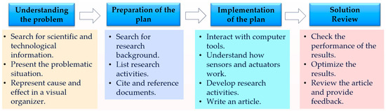 According to the previous diagram, research activities are structured following Polya’s four phases, beginning with understanding the problem, followed by devising a plan, implementing the plan, and finally, reviewing the solution [51,52]. In the problem-understanding phase, students conduct a search for scientific and technological information, define the problem situation, and represent cause-and-effect relationships. In the planning phase, they research previous studies, outline research activities or tasks, and document citations and references from consulted sources. During the plan implementation phase, students identify technological resources, interact with visual programming environments and electronic devices, and, once familiar with these resources, start developing the activities planned in the previous phase. Finally, in the solution review phase, they verify the functionality of the outcomes, optimize the results, and review the scientific article.