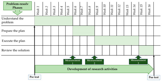 Research activities were conducted in the formative research course, corresponding to the first semester of the Systems Engineering Program, during the first academic semester of 2024. These activities were carried out under the constant supervision and feedback of the instructor, with a standardized feedback protocol (a checklist) established to minimize instructor bias. Figure 2 illustrates the timeline diagram for developing research activities according to the problem-solving phases, spanning a total of 16 weeks: the problem understanding phase (5 weeks), plan development (3 weeks), plan execution (6 weeks), and solution review (2 weeks).