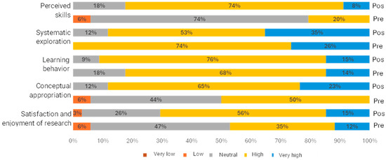 Perceived Skills: This dimension involves the recognition by university students of their own skills and attributes, whether cognitive, metacognitive, psychomotor, or socio-affective, related to formative research [69]. After the intervention, the results showed that 74% of students had a high perception of this dimension. These outcomes were due to the skills acquired through investigative activities conducted following the four phases of problem-solving. These activities involved solving problems related to the students’ context, such as agriculture, livestock, aquaculture, and the environment, which fostered critical thinking, computational thinking, and other skills [73,74].