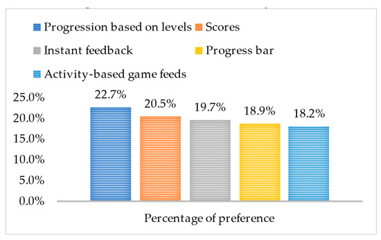 In terms of learner preferences, game-based learning techniques show a relatively even distribution. Students value a variety of gamification techniques, with an emphasis on those that provide a sense of advancement, competence, and immediate feedback [26]. This distribution of preferences is illustrated in the Figure 2 below.