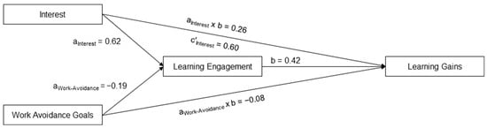 We assumed that interest, learning goals, and work avoidance goals would demonstrate an effect on learning gains mediated by learning engagement (Hypotheses 3a, 3b, 3c). For our mediation analysis, we relied on the software JASP (Version 0.17.2.1) [48]. We entered interest, learning goals, and work avoidance goals as the predictors, learning engagement as the potential mediating variable, and learning gains as the dependent variable. The software calculated 95% bootstrap percentile CIs from 5000 bootstrap samples. It revealed the following effects (standardized estimates) on learning engagement, R2 = 0.40. We found statistically significant effects (a paths) of interest and work avoidance goals on learning engagement, aInterest = 0.62, p < 0.001 and aWork-Avoidance = −0.19, p = 0.003, but not of learning goals, aLearning = 0.06, p = 0.467. Learning engagement revealed a statistically significant effect on learning gains, b = 0.42, p < 0.001. There was also a direct effect of interest on learning gains c′Interest = 0.60, p < 0.001 and an indirect effect of interest on learning gains via learning engagement, aInterest × b = 0.26 [0.07, 0.60]. Furthermore, we detected an indirect effect of work avoidance goals on learning gains via learning engagement, aWork-Avoidance × b = −0.08 [−0.18, −0.02]. However, a statistically significant indirect effect of learning goals on learning gains via learning engagement could not be detected, aLearning × b = 0.03 [−0.04, 0.12]. The confidence intervals not including zero support the conclusion that learning engagement mediated both the positive effect of interest and the negative effect of work avoidance goals on learning gains. Figure 1 illustrates our mediation results.
