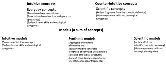 Vosniadou’s perspective, named the “framework theory” [2], is based on studies of children’s scientific emergence, suggests a hierarchical structure that includes the notions of concepts, models, ontology, and epistemology (See Table 1 and Figure 1). Within this framework, a concept is seen as the specific representation that a child has regarding a process or an object. Concepts can be divided into two different kinds, intuitive concepts and counter-intuitive concepts. Models are defined in a broader perspective as a child’s understanding of a process, the sum of the concepts and the epistemological and ontological principles which children use for explaining a phenomenon. Vosniadou’s theory makes some crucial adjustments to the theories that understand scientific emergence as a mere process of steady accumulation of scientific fragments. Changes in a specific concept of a process are important milestones, but learning is also a process of qualitative changes from one type of model to another. These models or frameworks are based on broader ontological and epistemological principles which guide how the child interacts with reality. Ontology refers to the set of more general ideas on the nature of reality, whereas epistemology refers to the causative mechanisms used to describe and explain a phenomenon [18]. Therefore, a change of an individual concept is interrelated with a broader structural change in a framework of ideas.