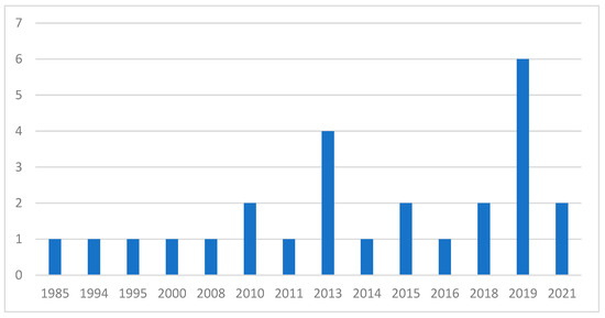 To achieve the goal, a literature study was performed on the 10th of September 2021 using ERIC with the words “preschool natural science” as the topic. The search resulted in 200 articles. From these, the papers which focused on a different educational level or population, like the parents and teachers, were excluded. Since the focus of the analysis was children’s conceptions of natural science processes, articles which focused on experimental pedagogic practices were mostly excluded. The result was 53 articles remaining, and out of these, 28 articles were chosen focusing on theoretical variation and diverse natural science content. The fields which were included were: children’s perceptions of the Water cycle and Cloud formation [27,28], Evaporation [29], Light [10], Heat [30], Shadow [31], Lunar phases [32], Thermometer [33], Contraction and expansion (iron heated ball) [34], Combustion (candle) [35], Friction [13,36], Animal taxonomy/animal-environment specificity/adaptation [11,37,38], Aliveness [39], Fungi [40], Germs [41], Environmental biology [42], Gardening and early math [43], Understanding of food [44], Conceptions of Water, Molecules, and Chemistry [45], Molecules and atoms [46], Rocks [47], Water Physics [48], Sound in space [49] and Density [23]. The first article included was published in 1985, with an increasing number of published works after 2010 (See Figure 3).