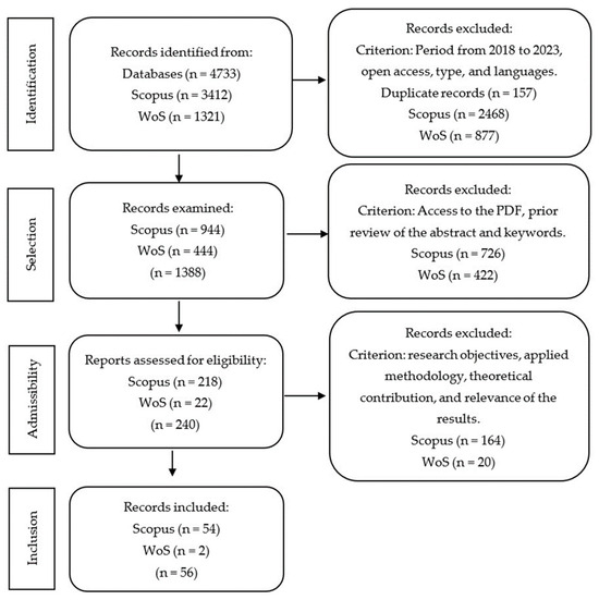 After an exhaustive analysis, 56 articles were selected to work with, 54 belonging to the Scopus database and 2 to WoS, based on the following inclusion and exclusion criteria: