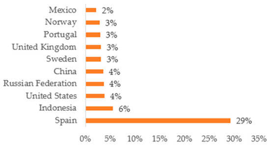 In the analysis of the Scopus results (Figure 2), it was identified that Spain is the country with the most research on the subject of analysis, representing 29% of the total, followed by Indonesia with 6%, the United States, Russia and China with 4%, Sweden, the United Kingdom, Portugal and Norway with 3% and finally Mexico with 2%.