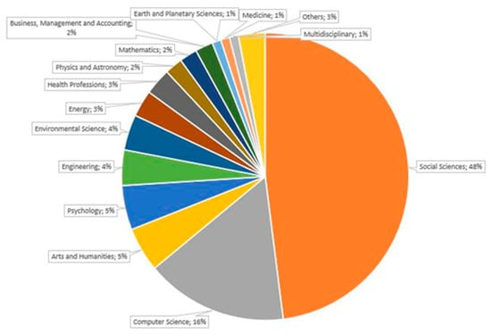 These articles focus on two large thematic areas: 48% in Social Sciences and 16% in Computer Sciences, 5% in Arts and Humanities, as well as Psychology, 4% in Engineering and Environmental Sciences and 3% in Energy and Health Professions, as seen in Figure 3.