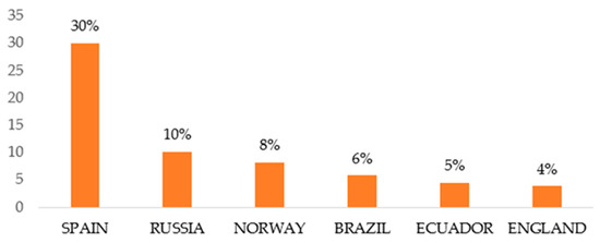 In the analysis by country, Figure 4 shows that in WoS, Spain leads with 30%, followed by Russia with 10%, Norway with 8%, Brazil with 6%, Ecuador with 5% and England with 4%.