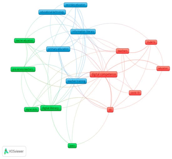 In a more exhaustive analysis based on the keywords of the selected articles, Figure 6 shows where three clusters have been formed related to the two variables of the study: digital literacy corresponds to the green cluster, and information literacy corresponds to the blue cluster. But, it is important to highlight that these variables are related to a third generated cluster, the digital competence variable, which corresponds to the red cluster.