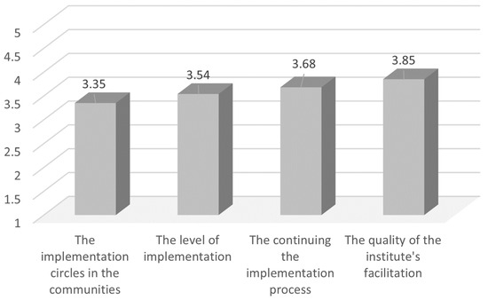 The next step entailed analyzing the attitudes of leading team members in relation to several aspects: quality of the institution’s facilitation, implementation circles in the communities, feelings regarding the level of implementation, and feelings about continuing the process. Relatively positive attitudes were found with respect to all aspects (See Figure 2).