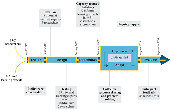 To identify EEK! recipients during the distribution process, museums began with the EEK! application process. A key criterion for museum selection was their self-reported capacity for broadening participation via diversity of audiences served and types of programs offered (more detail on broadening participation efforts can be found in Section 3.3). Two museums that participated in the design process received EEK! alongside 49 new museum partners. The 51 institutions varied in their specialties, preferred facilitation methods, the communities in which they sat, programmatic offerings, partnerships, and regional and institutional structures with which they interacted. The physicality of the institutions also varied, with some museums being entirely mobile, particularly in rural areas where it was easier to visit remote communities rather than having a physical space for the community to come to. Including flexibility as a design component also proved critical for rapidly adapting the kits in response to the COVID-19 pandemic. Educator capacity-focused training prioritized ongoing co-creation by focusing most of the two-day training sessions on informal educators working with CELL-MET researchers to brainstorm and share potential modifications and extensions, based on the characteristics and needs of their unique institutions and the communities they served. Ongoing co-creation after distribution took place both formally, through group meetings, and informally, through one-on-one discussions and support based on the participants’ unique needs. Thirty-seven survey respondents reported reaching 13,554 learners and their families. This number is conservative, with several participants sharing via personal communication that they did not report on reach via activity downloads, video views, or—in the case of one science center—the EEK! news story reach. See Figure 1 for a visual overview of the EEK! design process and key inputs.