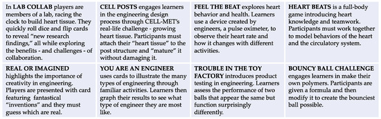 In total, the kit contains seven flexible, “hands-on, minds-on” [67,68] activities, and instructions for an additional eighth take-home or extension activity. The activities range from card-based activities to full-body games. See Figure 2 for brief descriptions of the eight activities. While some of the activities focus more heavily on engineering concepts, like Cell Posts, which asks learners to use the engineering design process to simulate “building heart tissue”, other activities, such as You are an Engineer, focus less on engineering skills and more on engineering identity and interest in service of lessening cognitive barriers and increasing intrinsic motivation. Though not the focus of this paper, the authors posit that increasing intrinsic motivation is critical to the field of engineering education, as it increases resilience in the face of challenges.